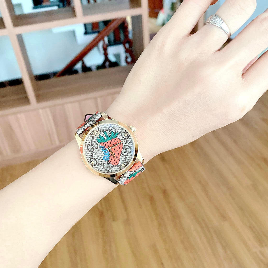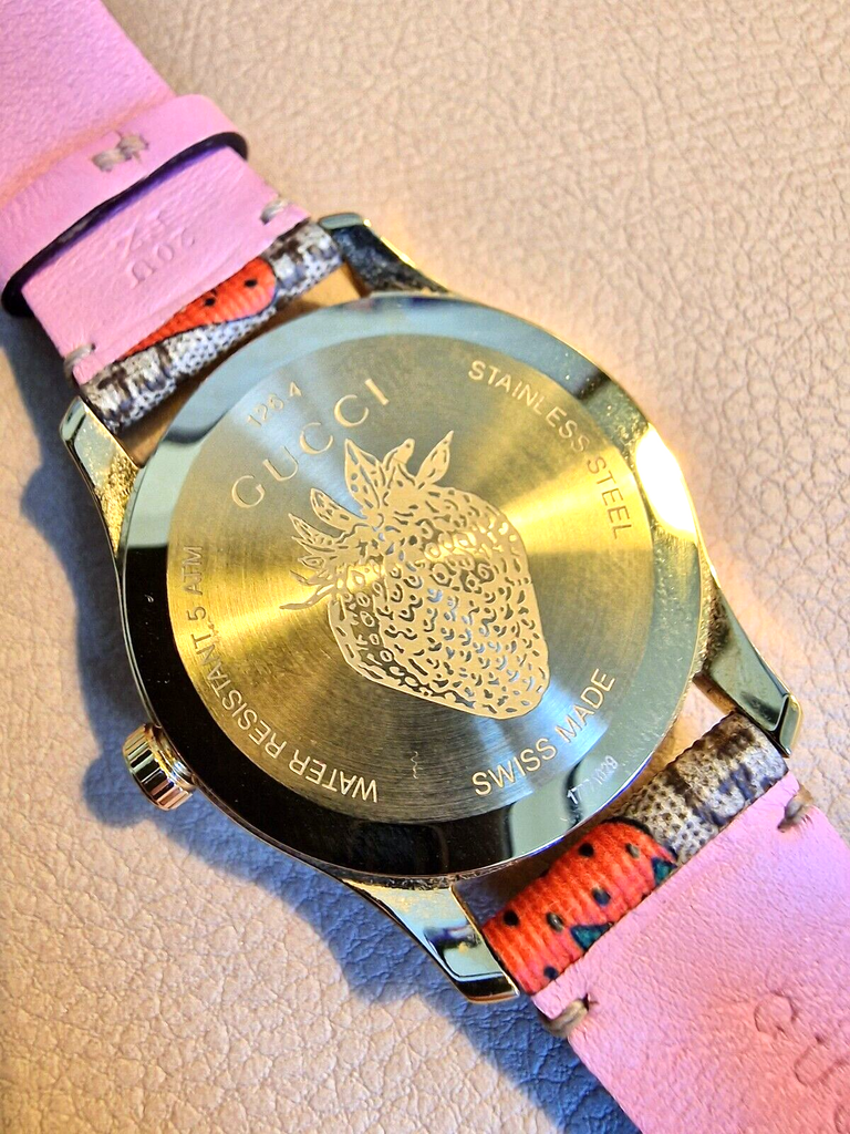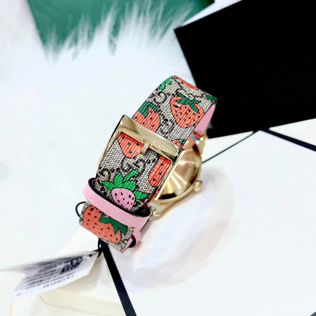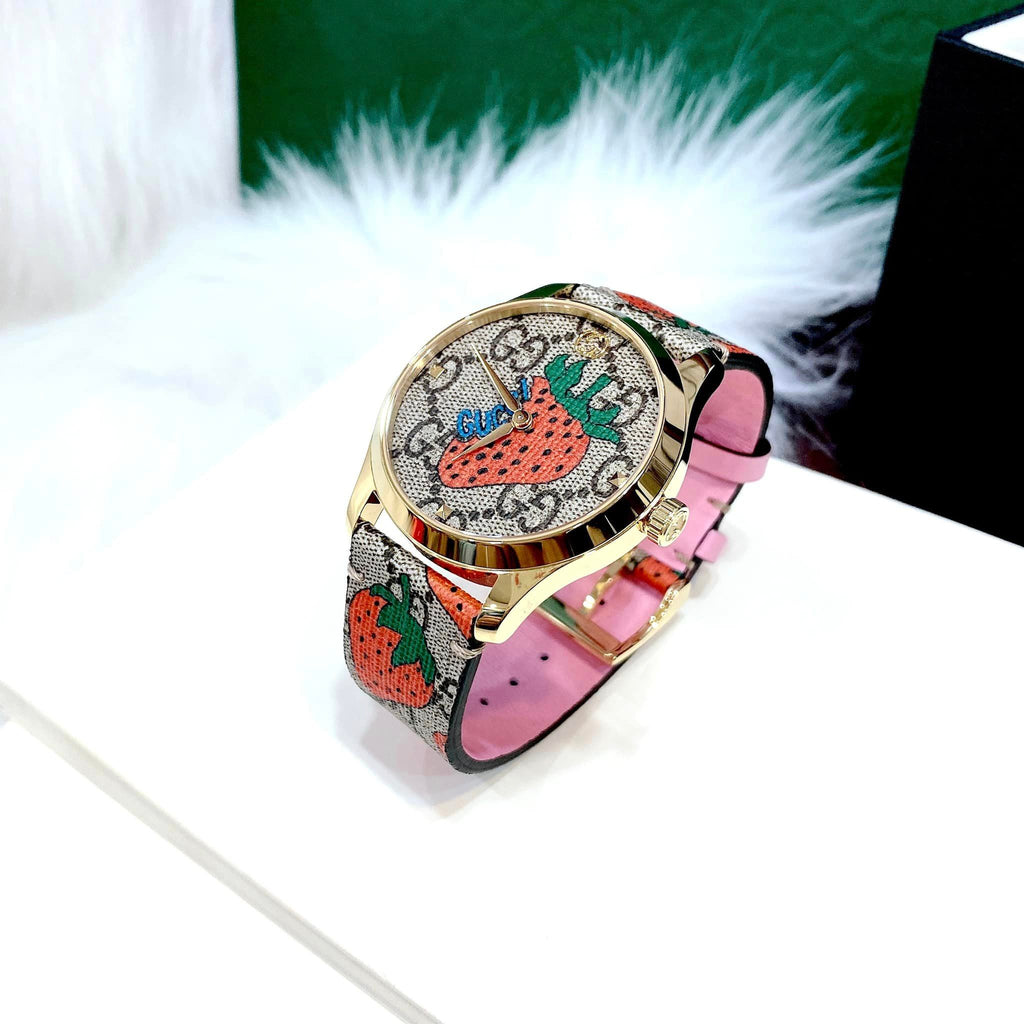 At the centre of the dial is a bitten strawberry with the word Gucci in blue, accented by yellow gold PVD indexes and an Interlocking G. Yellow gold PVD case, GG Supreme canvas dial and strap with Gucci Strawberry print Ronda quartz movement Water resistance: 5 ATM (160 feet/50 metres)