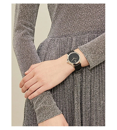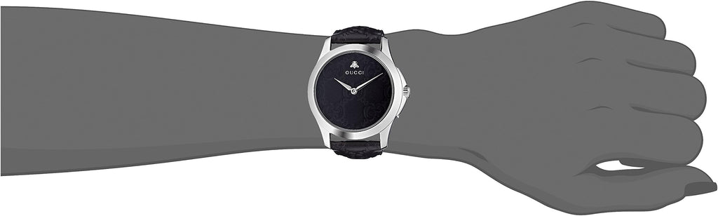 Silver-tone stainless steel case with a black leather strap. Fixed silver-tone stainless steel bezel. Black (gg logo) dial with silver-tone hands. No markers. gucci bee motif logo at the 12 o'clock position. Dial Type: Analog. Quartz movement.