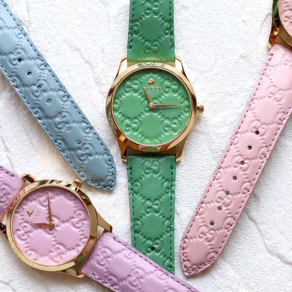 Gucci G-Timeless Signature YA1264097 is a beautiful and trendy Ladies watch from G-Timeless Signature collection. Material of the case is PVD Gold plated and the Blue dial gives the watch that unique look. In regards to the water resistance, the watch has got a resistancy up to 50 metres.