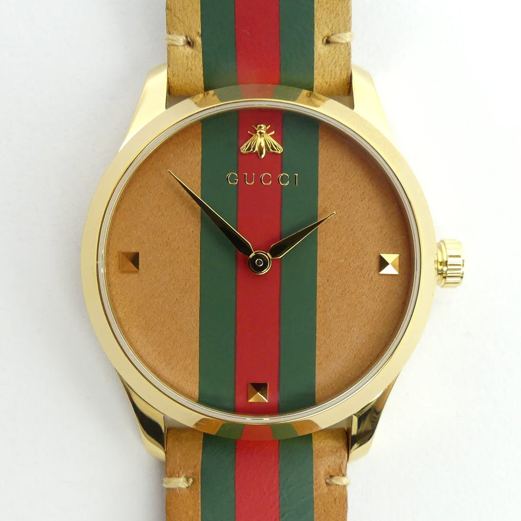 Yellow gold PVD stainless steel case with a brown (stiped) leather strap. Fixed yellow gold PVD bezel. Brown (stripe motif) dial with yellow gold-tone alpha-style shape hands. Pyramid markers at the 3, 6 and 9 o'clock positions. Dial Type: Analog. Quartz movement.Scratch resistant sapphire crystal. Pull / push crown. Solid case back. Round case shape. Case size: 38 mm. Case thickness: 9 mm. Band width: 19 mm. Tang clasp. Water resistant at 50 meters / 165 feet. Functions: hour, minute. G-timeless Series. Dress watch style. Watch label: Swiss Made. Gucci G-Timeless Brown Dial with Stripe Motif Striped Leather Watch YA1264077.
