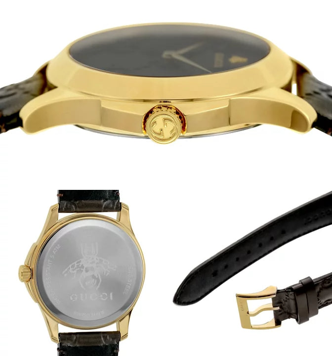 Yellow gold PVD stainless steel case with a brown leather strap. Fixed yellow gold PVD bezel. Brown (GG logo) dial with yellow gold-tone hands. No markers. The Gucci bee motif logo appears at the 12 o;clock position.