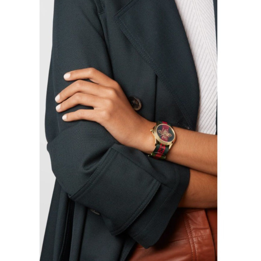 The Gucci Garden continues to be a limitless source of inspiration for the House, rich with animals and creatures that appear throughout the collections. The Web dial of this watch features the Gucci bee—a historical symbol from the '70s archives—set within a gold-coloured case on nylon Web strap.