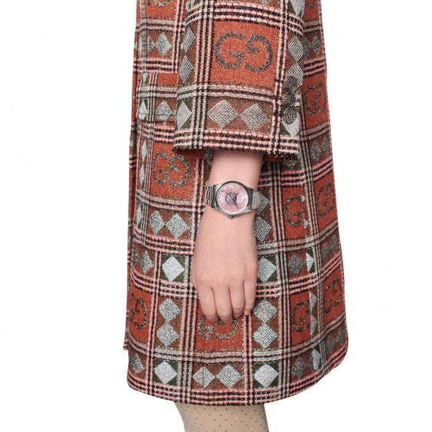 A new introduction for Epilogue collection, the G-Timeless watch is reimagined with the Mystic cat set against a pink mother of pearl dial. The feline is highlighted by silver-toned indexes that take the form of the Gucci bee, hearts and stars—distinctive codes of the House. The steel case continues into a bracelet that wraps around the wrist. Steel case and bracelet, pink mother of pearl dial with multi icon indexes and feline head Sapphire glass with antireflective coating