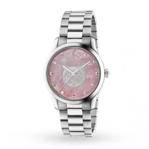 Stainless steel case with a stainless steel bracelet. Fixed stainless steel bezel. Pink mother of pearl (feline head) dial with silver-tone hands and multi icon indexes hour markers. Dial Type: Analog. Quartz movement. Scratch resistant sapphire crystal. Pull / push crown. Solid case back. Round case shape. Case size: 38 mm. Fold over clasp. Water resistant at 50 meters / 165 feet. Functions: hour, minute, second. G-timeless Iconic Series. Dress watch style. Watch label: Swiss Made. Gucci G-Timeless Iconic Quartz Unisex Watch YA1264166.