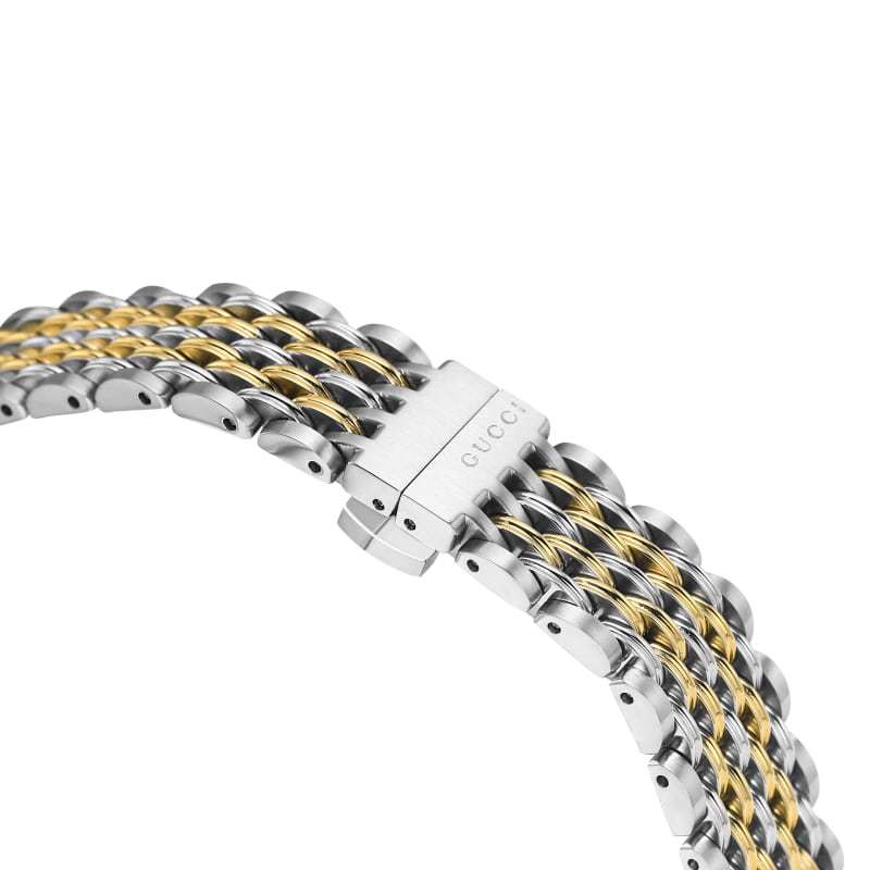 The G-Timless collection continues to explore emblematic House codes in new ways each season. A recognisable Gucci symbol, the bee appears as a subtle detail atop this watch. The accessory's pink dial is paired with a steel and gold PVD bracelet to add a delicate feel.