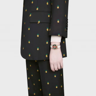 Yellow gold PVD stainless steel case with a off white leather strap. Fixed yellow gold PVD bezel. Green and red (embroidered bee motif) dial with gold-tone alpha-style hands. No markers. Dial Type: Analog. Quartz movement. Scratch resistant sapphire crystal. Pull / push crown. Solid case back.