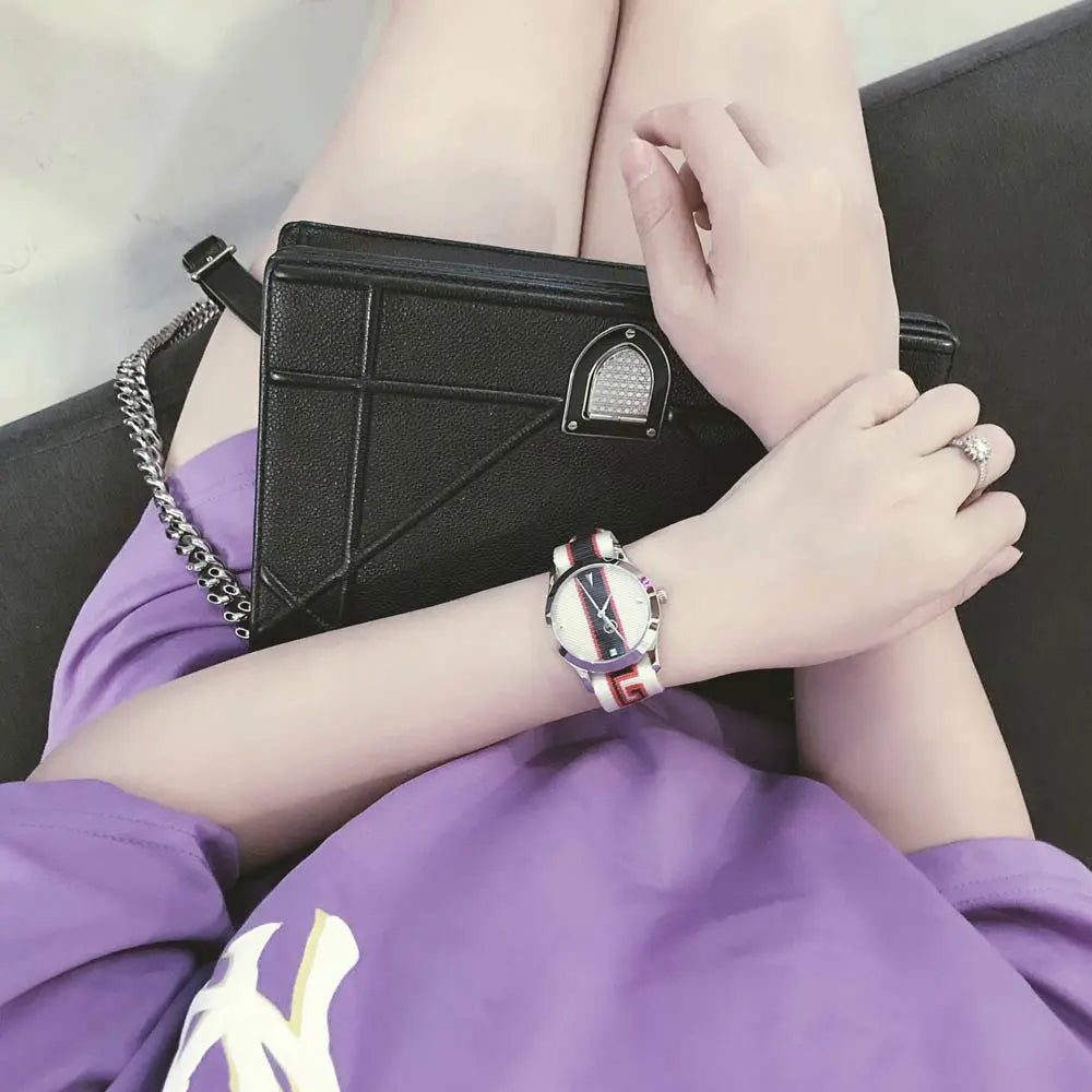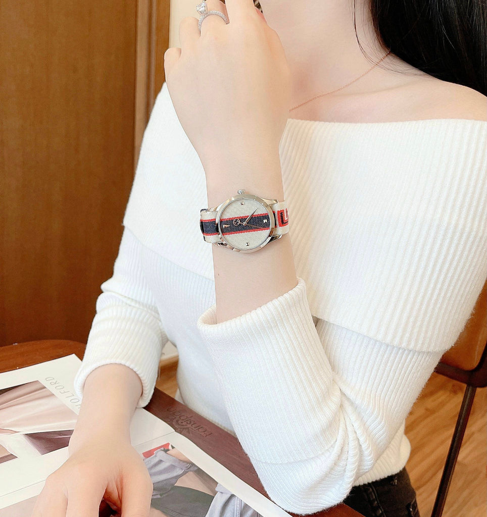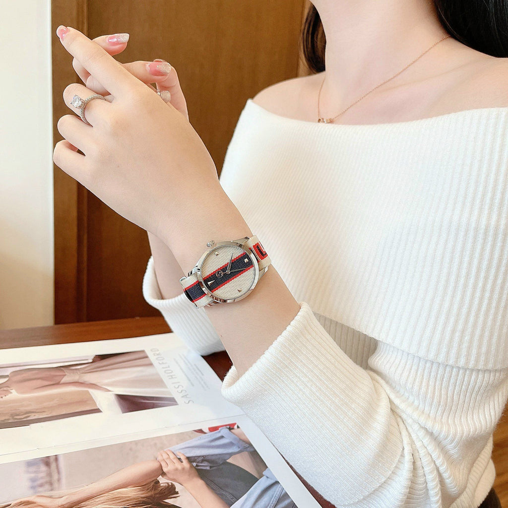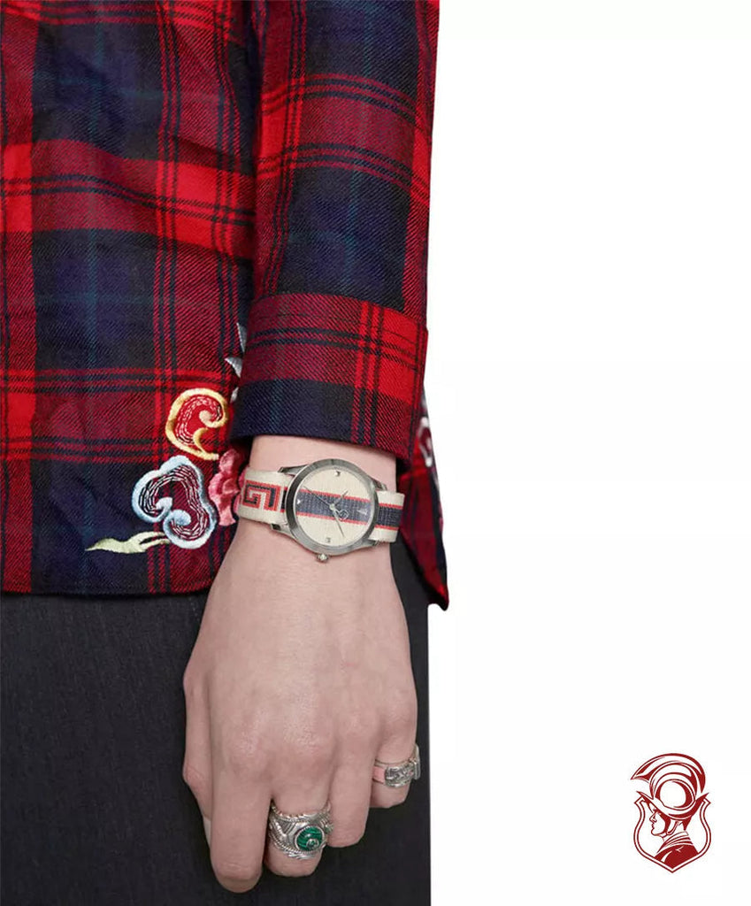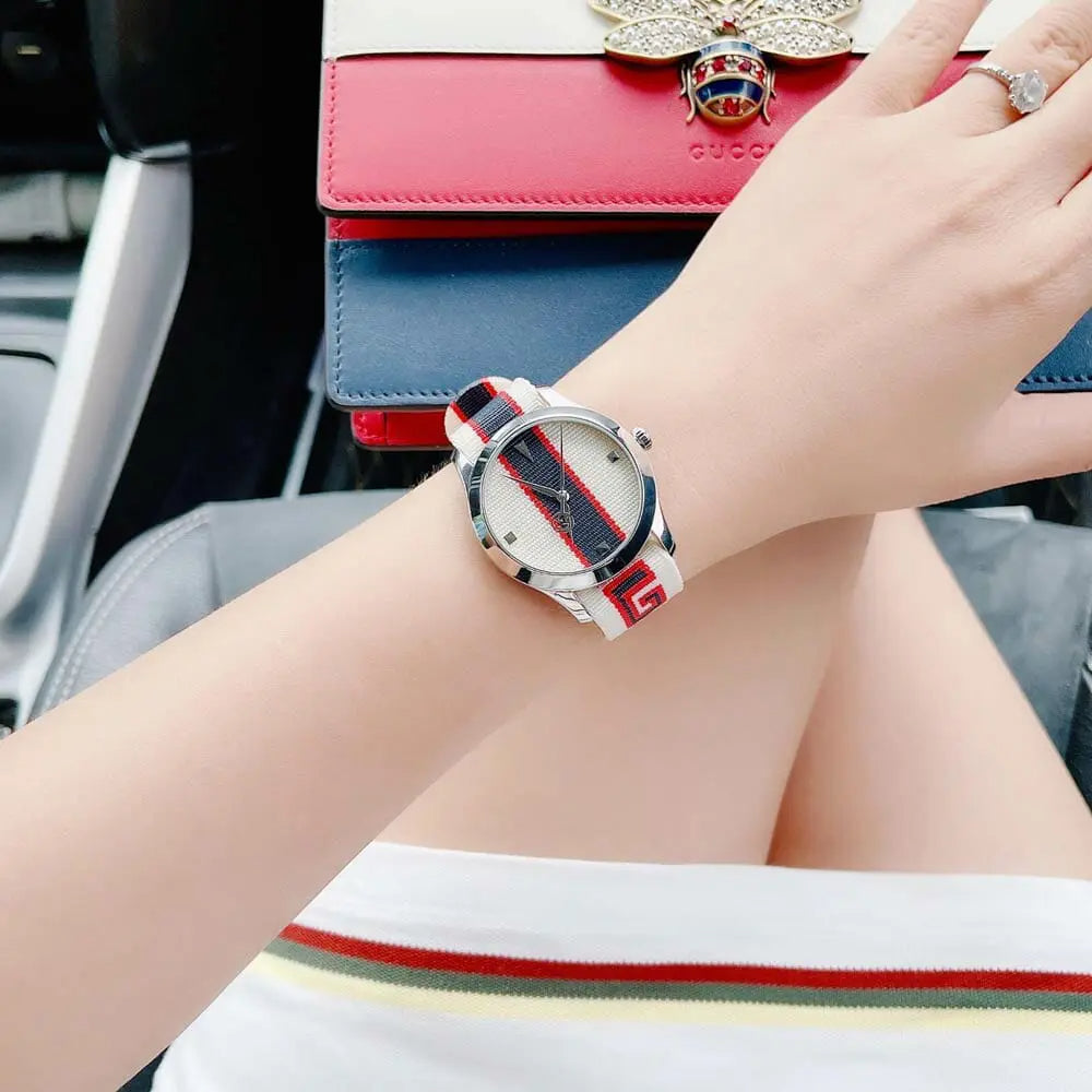 Quartz movement. Scratch resistant sapphire crystal. Pull / push crown. Solid case back. Round case shape. Case size: 38 mm. Case thickness: 10 mm. Band width: 20 mm. Tang clasp. Water resistant at 50 meters / 165 feet. Functions: hour, minute, second. Casual watch style. Watch label: Swiss Made. Gucci G-Timeless White/Red/Blue Dial Men's Watch YA1264071.