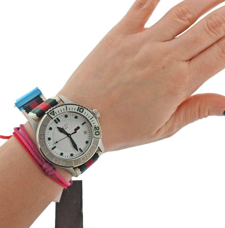 Case thickness: 11 mm. Round case shape. Band width: 20 mm. Band length: 9 inches. Tang clasp. Water resistant at 50 meters / 165 feet. Functions: hours, minutes, seconds, date. Casual watch style. Watch label: Swiss Made. Gucci G Timeless Striped Nylon Men's Watch YA126231.