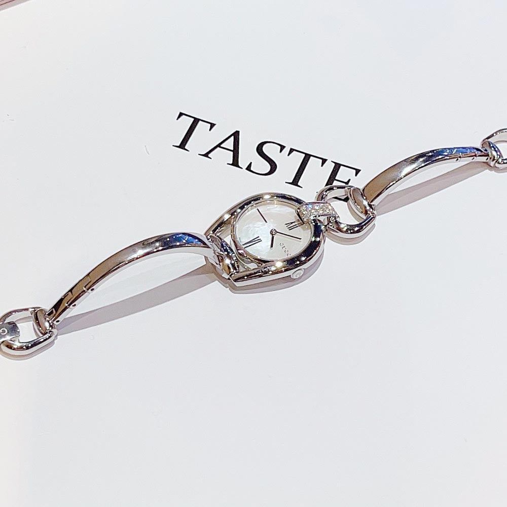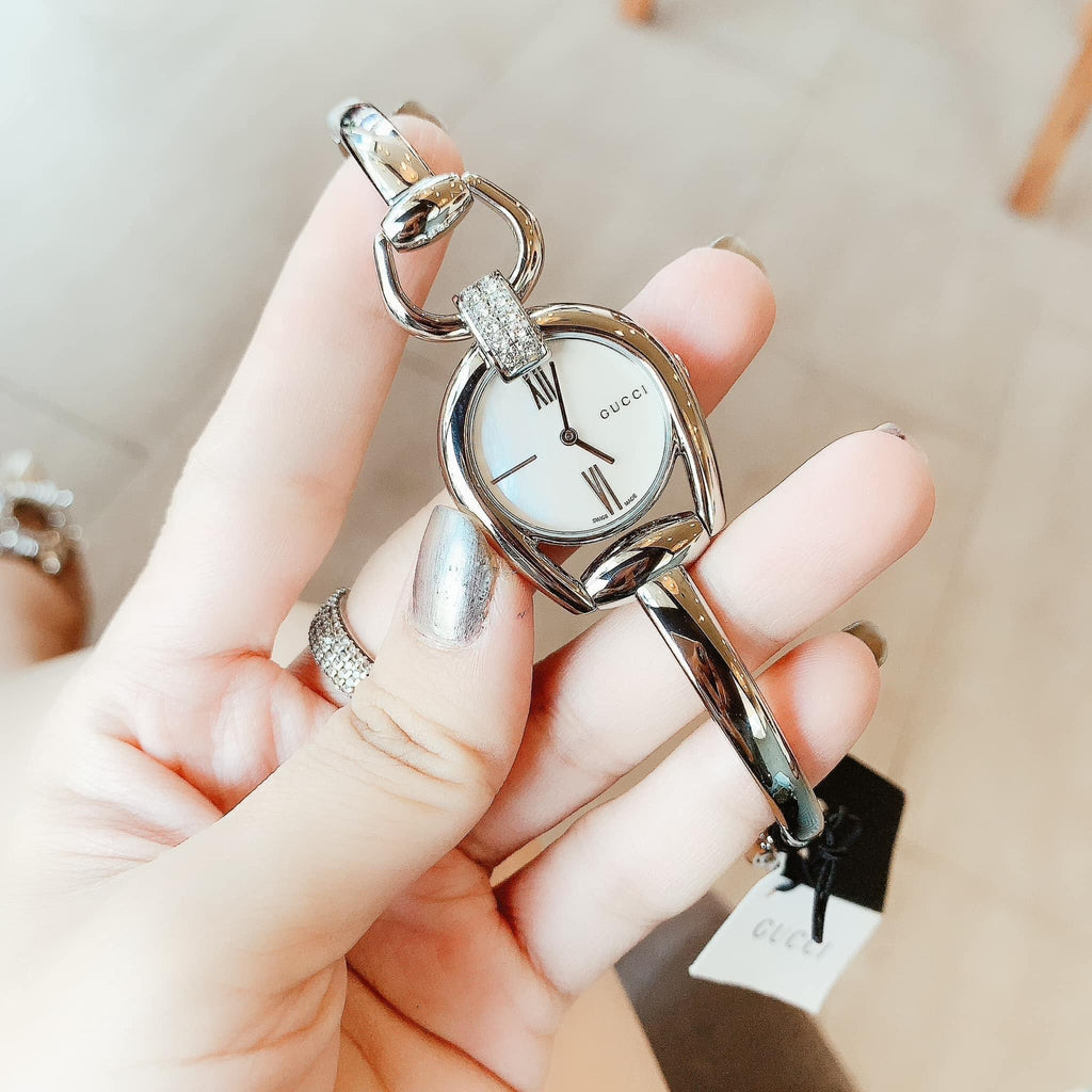 Stainless steel case with a stainless steel bangle bracelet. Diamond set lug. Fixed stainless steel bezel. White mother of pearl dial with silver-tone hands. Roman numerals mark the 6 and 12 o'clock positions. The Gucci name appears at the 3 o'clock position. Dial Type: Analog. Quartz movement.Scratch resistant sapphire crystal. Pull / push crown. Solid case back. Case size: 28 mm. Case thickness: 6.5 mm. Round case shape. Band width: 6 mm. Band length: 7 inches. Jewelry clasp. Water resistant at 50 meters / 165 feet. Functions: hour, minute. Luxury watch style. Watch label: Swiss Made. Gucci Horsebit Small Whte Mother of Pearl Dial Ladies Watch YA139504.
