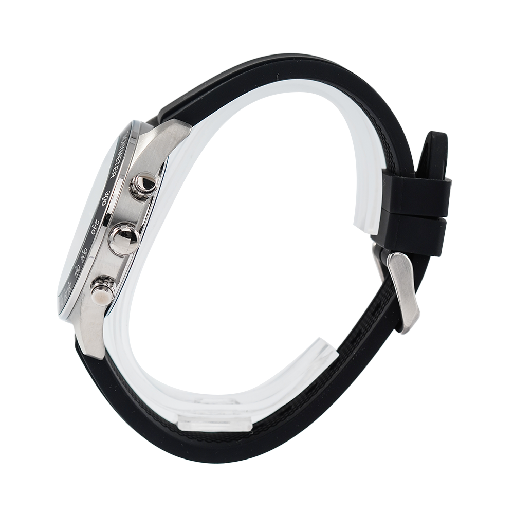 Be bold in this versatile dressed-up sports timepiece. This style has a multi-function dial paired with a silicone strap.