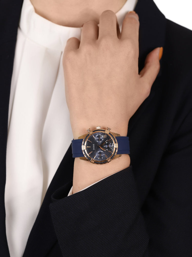 The blue strap is made of silicone - the material which is characterised by lightness and high level of damage resistance. It perfectly goes with the watch case. The navy blue dial is covered by a mineral crystal, which is renowned for its high resistance to shocks and scratches that are caused during everyday use. The watch has a water-resistance level of 3 ATM, which means watch is resistant to minor splashes. Guess W0562L3 is covered by the manufacturer's warranty and is packed in the original box.
