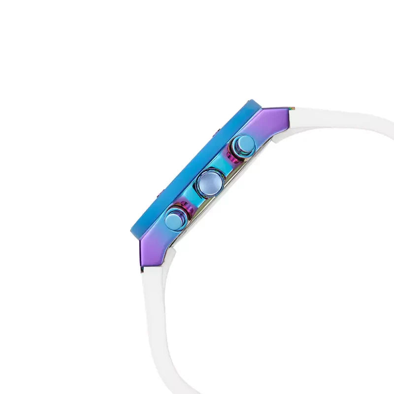 The watch has a purple-colored case, made of stainless steel, which looks like a real eye-catcher thanks to the matted, polished surface.