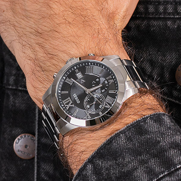 Guess Atlas Chronograph Black Dial Silver Steel Strap Watch For Men - W0668G3