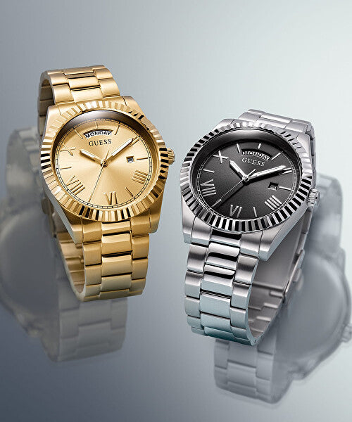 A classic look that never gets old. This coin edge bezel is integrated with a brushed and polished 3 link bracelet and featured a day of the week window at the 12 o'clock hour with a bubble date at the 3 o'clock.