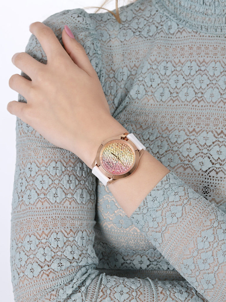 The crush timepiece from Guess features a rose gold plated stainless steel case. The case houses a glistening pink, yellow and orange bubble effect dial. The piece is finished with a contrasting soft white leather strap.