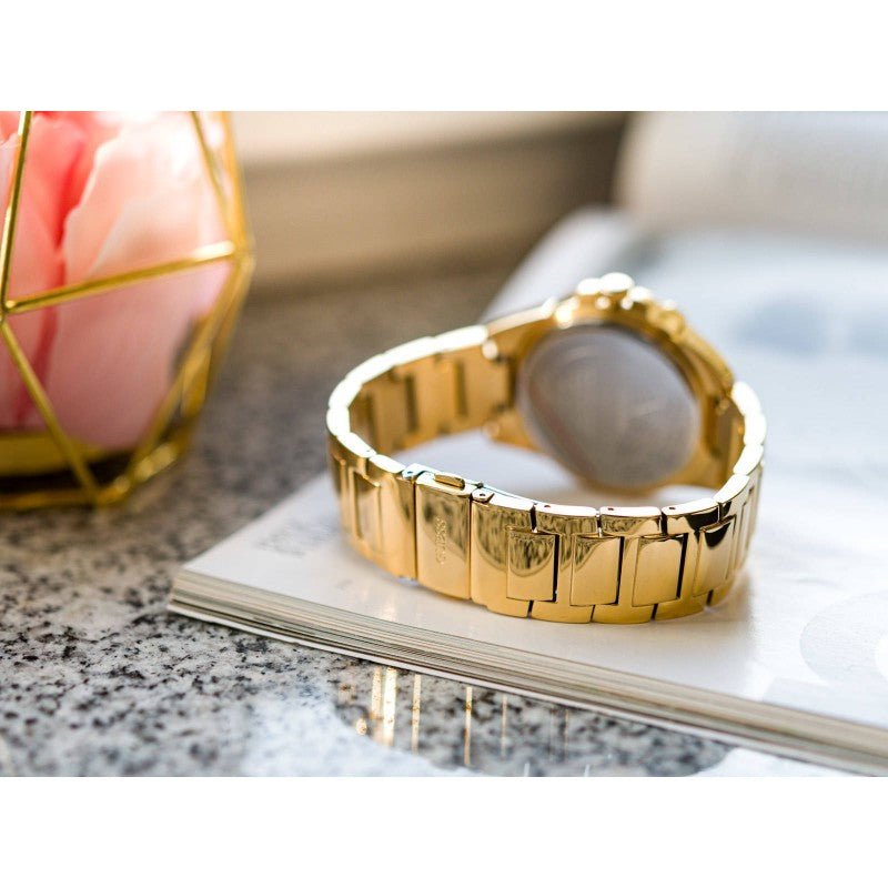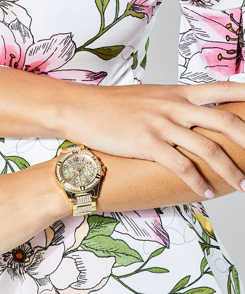 Yellow gold-tone stainless steel case with a yellow gold-tone stainless steel bracelet set with crystals. Fixed yellow gold-tone bezel set with crystals. Gold (crystal-set) dial with luminous yellow gold-tone hands and Arabic numeral hour markers. Minute markers around the outer rim. Dial Type: Analog. Luminescent hands.