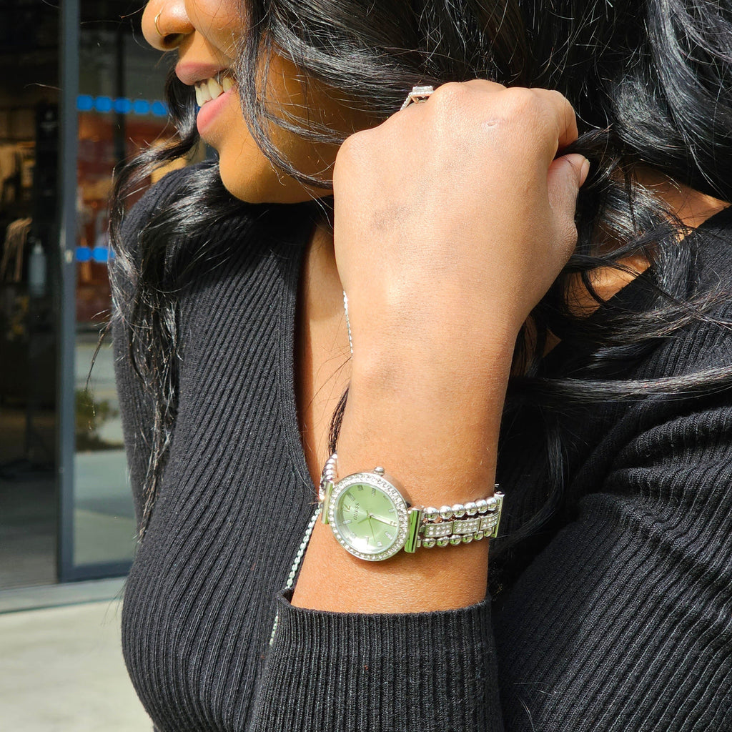 This intricate bracelet design is truly one of kind and beautifully crafted with its unique ball and crystal connection featuring a fully crystal bezel with tonal dial.