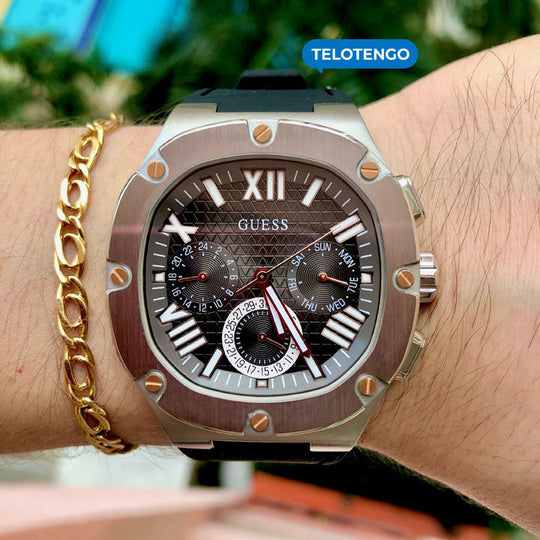 This headliner is sure to steal the show, it has a unique rounded square case design with screw details and a textured multi-function dial with ombre effect.