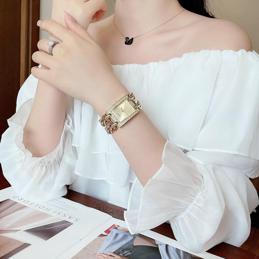 Guess MOD Heavy Metal Diamonds Gold Dial Gold Steel Strap Watch for Women - W0072L1