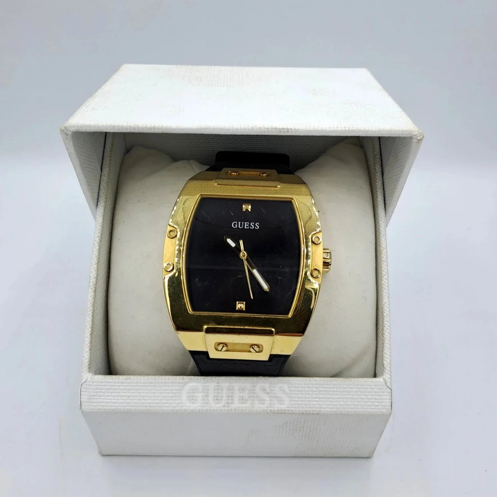 Black 27mm leather & silicone flex strap fits up to 7.75-inch wrist circumference Black sunray dial & gold-tone hands with two diamond markers Gold-tone 43mm tonneau stainless steel case Mineral glass crystal Water resistant to 50 meters (165 feet): In general, suitable for short periods of recreational swimming, but not diving or snorkeling