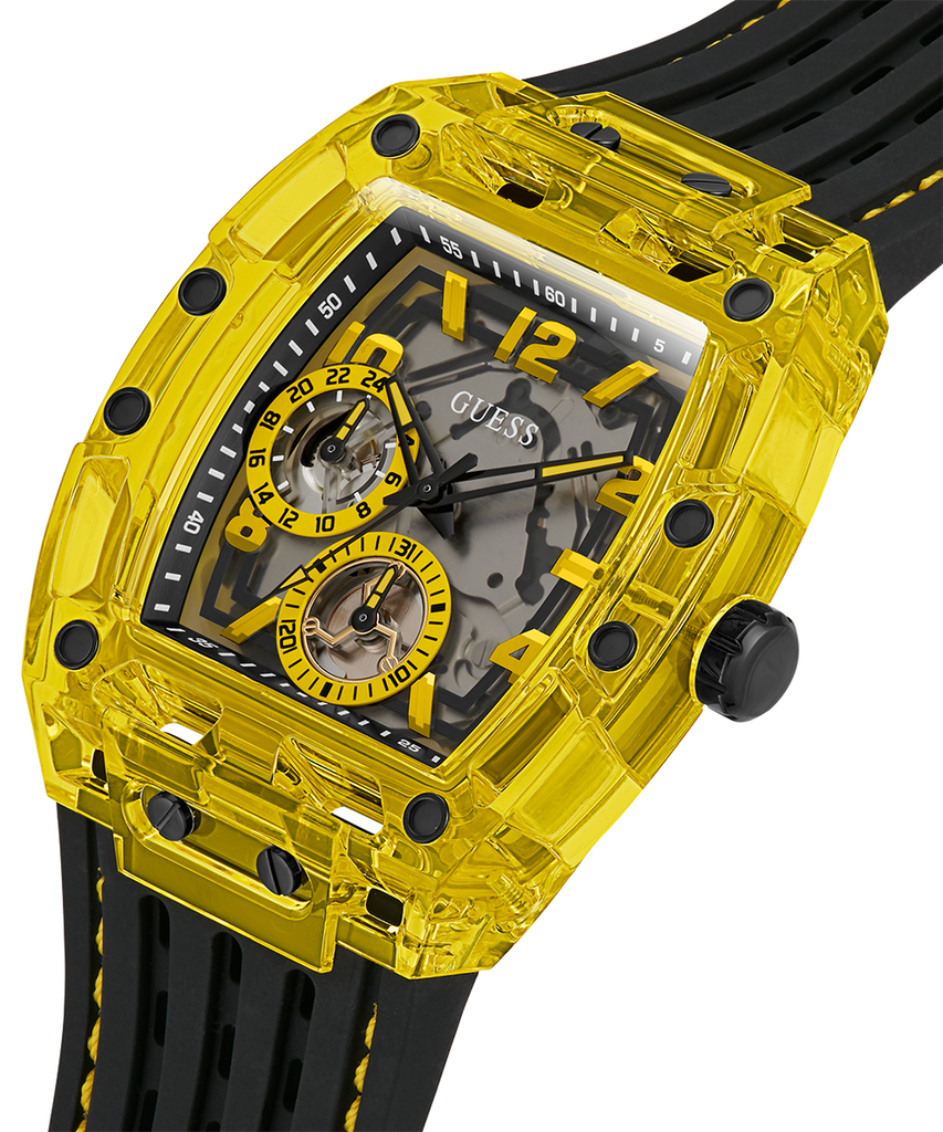 Skeleton dial details keep this phoenix on the rise. This style features a polycarbonate cut-thru barrel shaped case with black screw details and a cut-thru multi-function dial paired with a silicone strap with contrast stitching.
