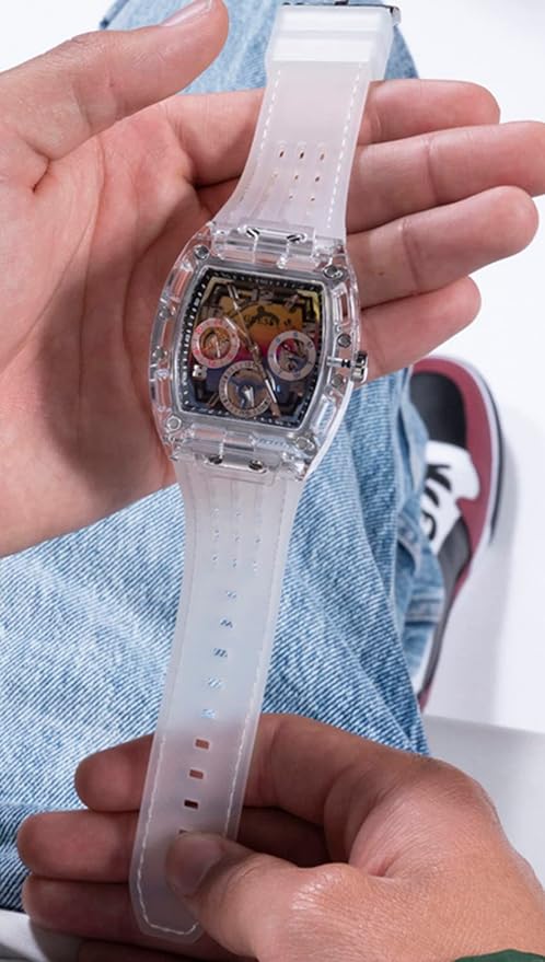 Skeleton dial details keep this phoenix on the rise. This style features a polycarbonate cut-thru barrel shaped case with screw details and a cut-thru multi-function ombre rainbow colored dial paired with a silicone strap