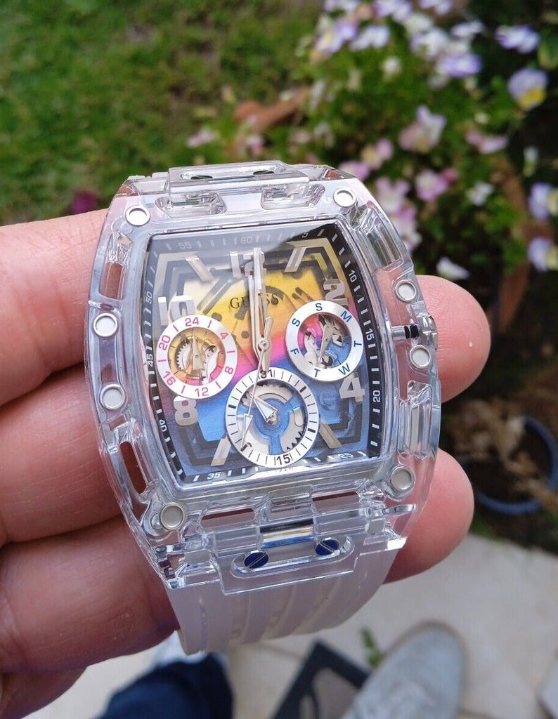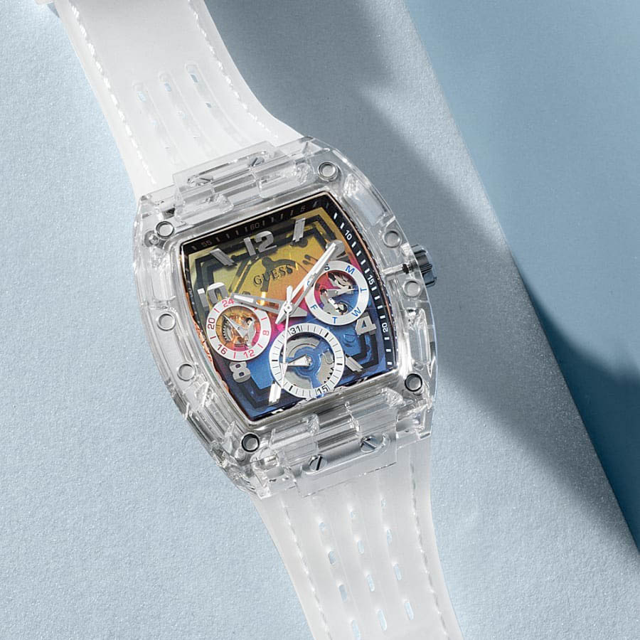 Guess Phoenix Polycarbonate Clear Multi-function Black Dial Clear Rubber Strap Watch for Men - GW0499G3