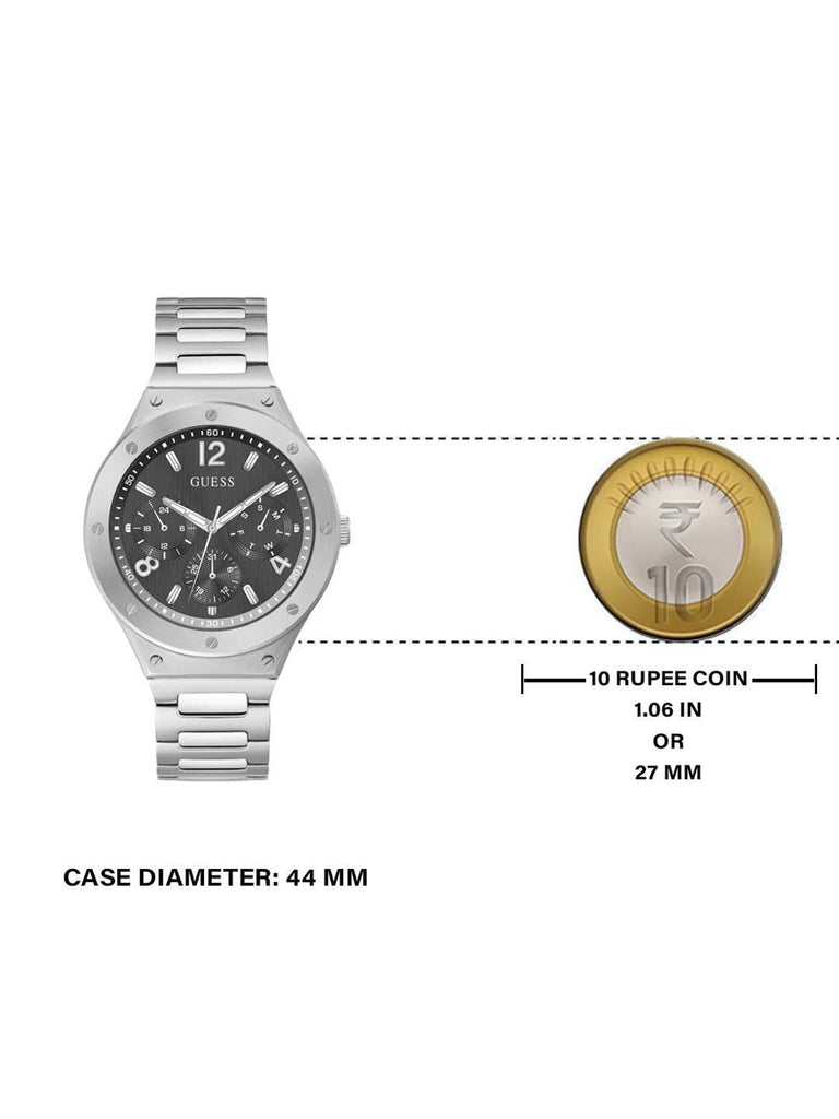 Guess Mens Classic Silver Tone Stainless Steel Case Black Dial Analog Mineral Glass Sunray Finish Multi-Function Silver Metal Bracelet Watch