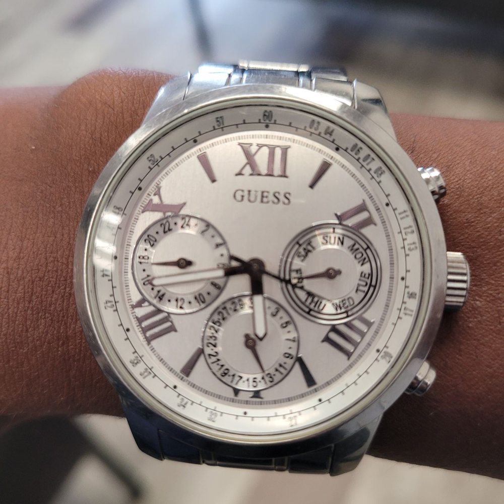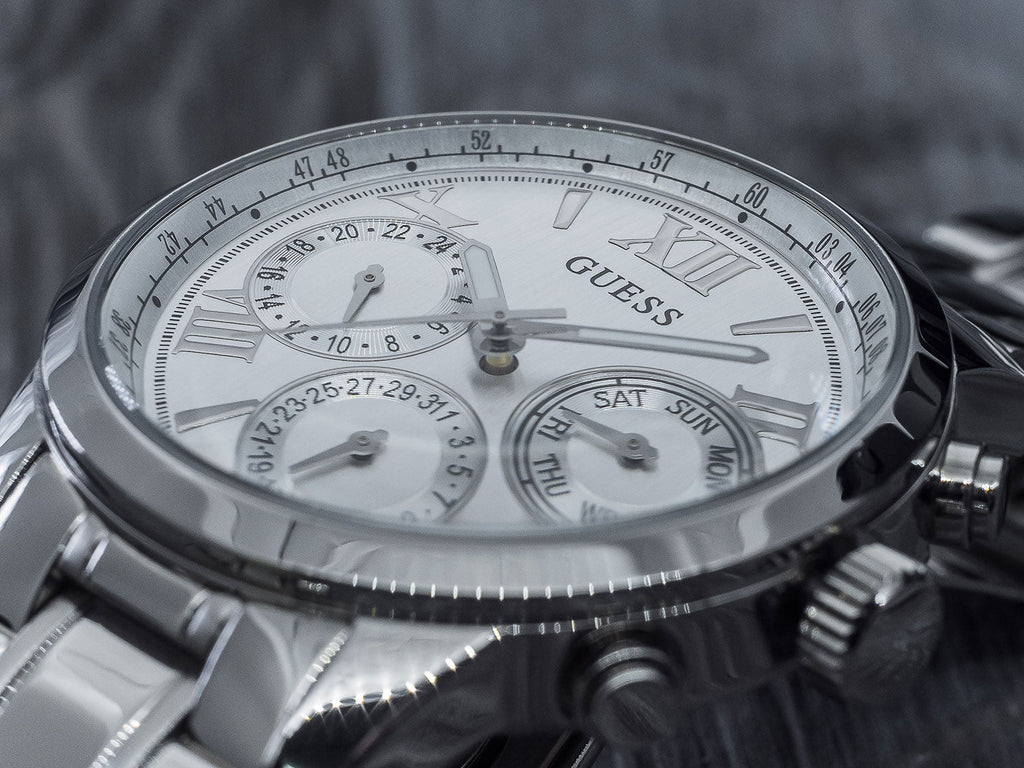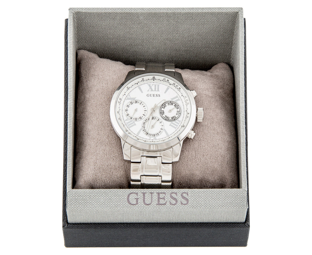 Silver-tone stainless steel case with a silver-tone stainless steel bracelet. Fixed silver-tone stainless steel bezel. White dial with silver-tone hands and Roman numeral hour markers. Minute markers around the outer rim. Dial Type: Analog. Luminescent hands. Date display at the 6 o'clock position. Three- date, day of the week, and 24 hours subdials. Quartz movement. Solid case back. Case size: 42 mm. Round case shape. Water resistant at 50 meters / 165 feet. Functions: date, day, hour, minute, second. Dress watch style. Guess Sunrise White Dial Ladies Multifunction Watch W0330L3.