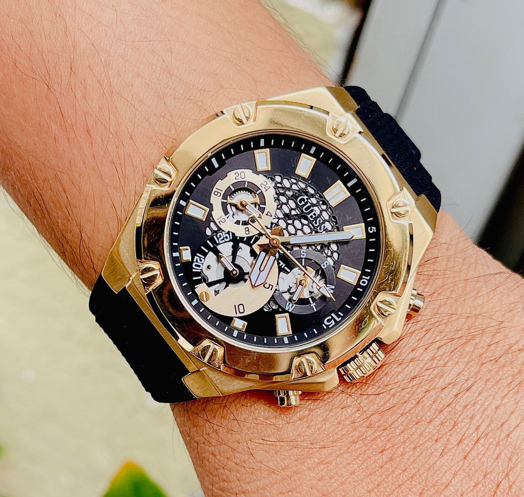 WHY IT’S SPECIAL Give your wrist a classy look with this men's watch by Guess. Encased in a 46 mm case, the round dial is protected by a crystal glass. It features multifunction functionality and a crown for time adjustment. The strap is crafted with care using silicon that gives a good finish.