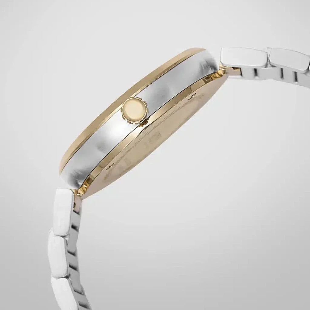 Stainless steel case with a two-tone (silver-tone and gold-tone) stainless steel bracelet. Fixed gold-tone bezel. Silver dial with gold-tone hands and index hour markers. Dial Type: Analog. Quartz movement. Scratch resistant mineral crystal. Pull / push crown. Solid case back. Round case shape. Case size: 36 mm.