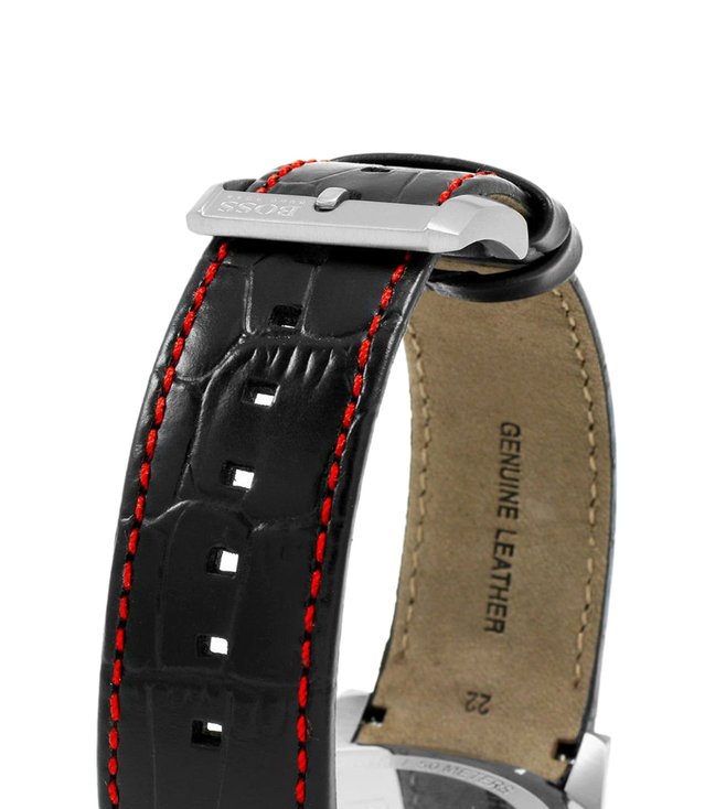 A racing-style chronograph watch by BOSS, featuring knurled subeyes, minute-tracking on the reflector ring and a black perforated leather strap.
