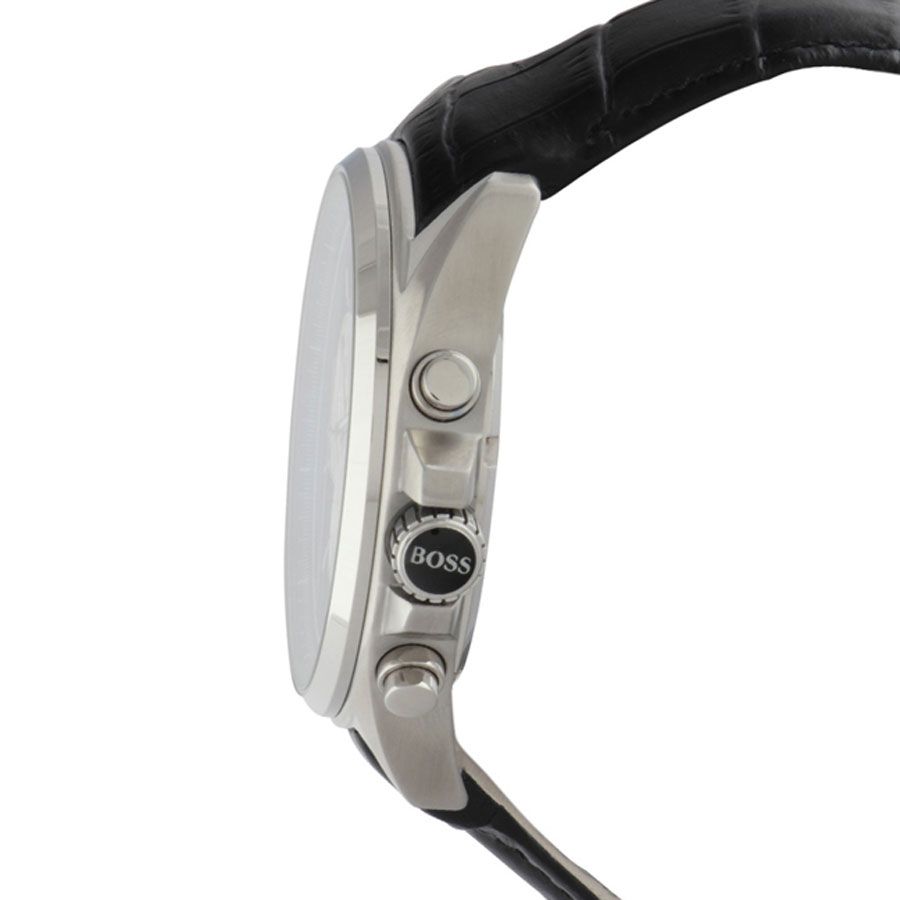 With a crocodile embossed leather strap, this watch by BOSS is also designed with a stainless steel case, blue dial, and chronograph movement.
