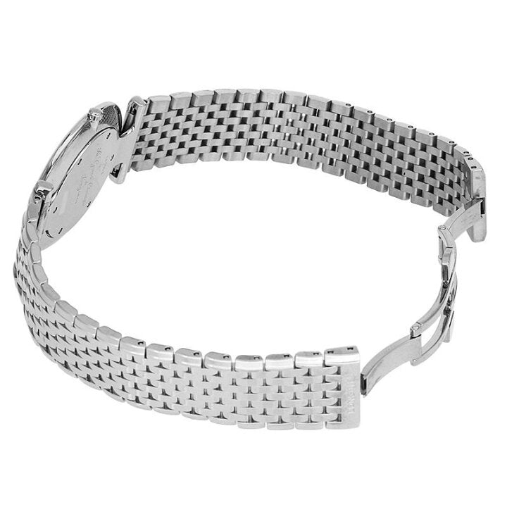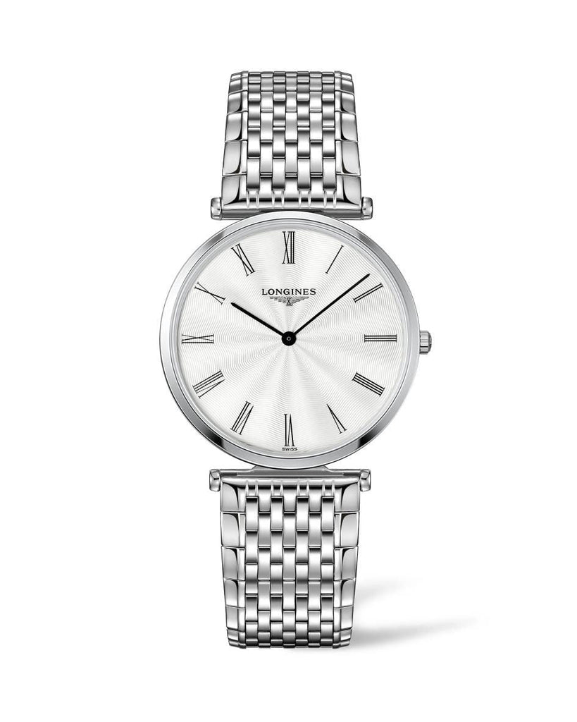 Ivory dial enhanced by silver-tone hands. Silver-tone stainless steel case with a silver-tone stainless steel band. Quartz movement. 300 meters / 1000 feet water resistance. Fixed bezel. Scratch Resistant Sapphire crystal. Solid caseback. Fold Over with Push Button Release clasp. Pull / Push crown. Case size 36 mm. Band 20 mm x long. Longines L4.755.4.71.6 La Grande Classique Watch.