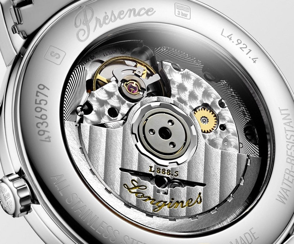 Longines Presence Automatic 38.5 mm watch. Model reference: L4.921.4.72.6. Stainless steel case. Silver dial. Automatic movement. Stainless steel bracelet with triple safety folding clasp and push-piece opening mechanism. Swiss made.