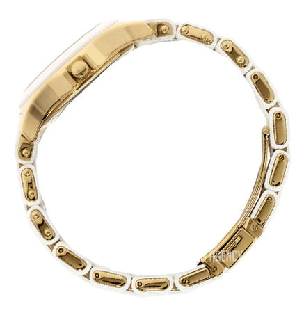 An elegant and highly stylish Marc by Marc Jacobs ladies watch, this design features a gold plated stainless steel case. The triple strand bracelet strap is white polycarbonate and the round dial is white with white accents, has three hand movement and displays the Marc by Marc Jacobs logo.