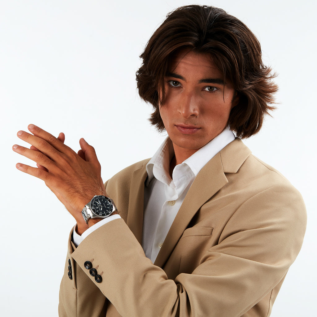 This model also has a rotating ceramic bezel, a screw-down crown and a screw-down transparent caseback. The water resistance of the watch is 10 ATM. The envelope and bracelet are made of silver stainless steel.