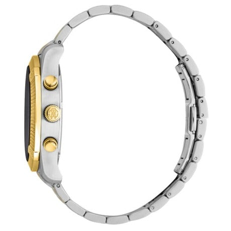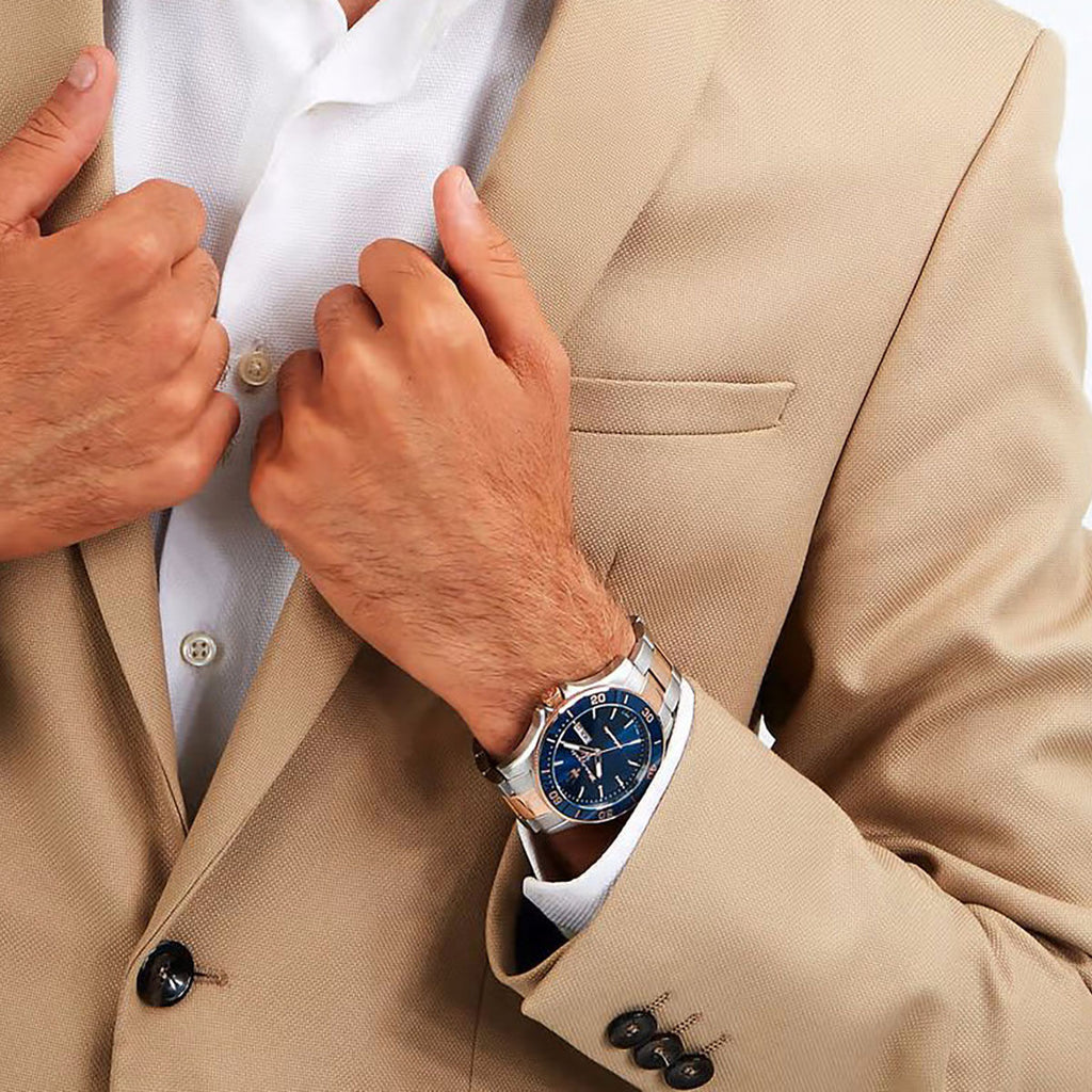 A must-have timepiece for all the watch aficionados, this men's analog watch from Maserati will be a perfect pick. The blue round dial is protected by a sapphire crystal. It features has a crown for time adjustment. Watch from the Competizione collection, automatic three-hand date movement, 43mm silver and gold steel case with a blue dial on a silver and gold steel bracelet.