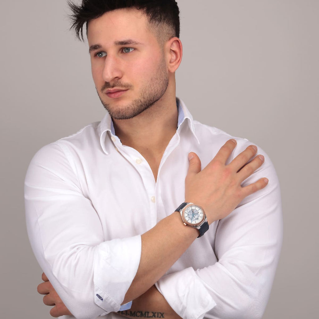 The watch bezel is rose gold plated. Blue leather strap. The blue hands contrast with the white dial. At the centre of the dial is a large skeleton opening. Three-hand watch and automatic MVT movement 42mm stainless steel case, rose gold plated White dial with blue details Blue leather strap