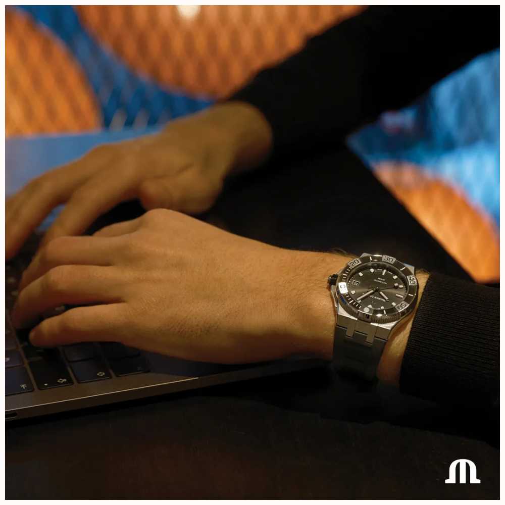 This Maurice Lacroix watch has a 38 mm diameter stainless steel case and is fitted with a rubber strap. The case contains a Sellita movement and the watch has a Sapphire crystal.