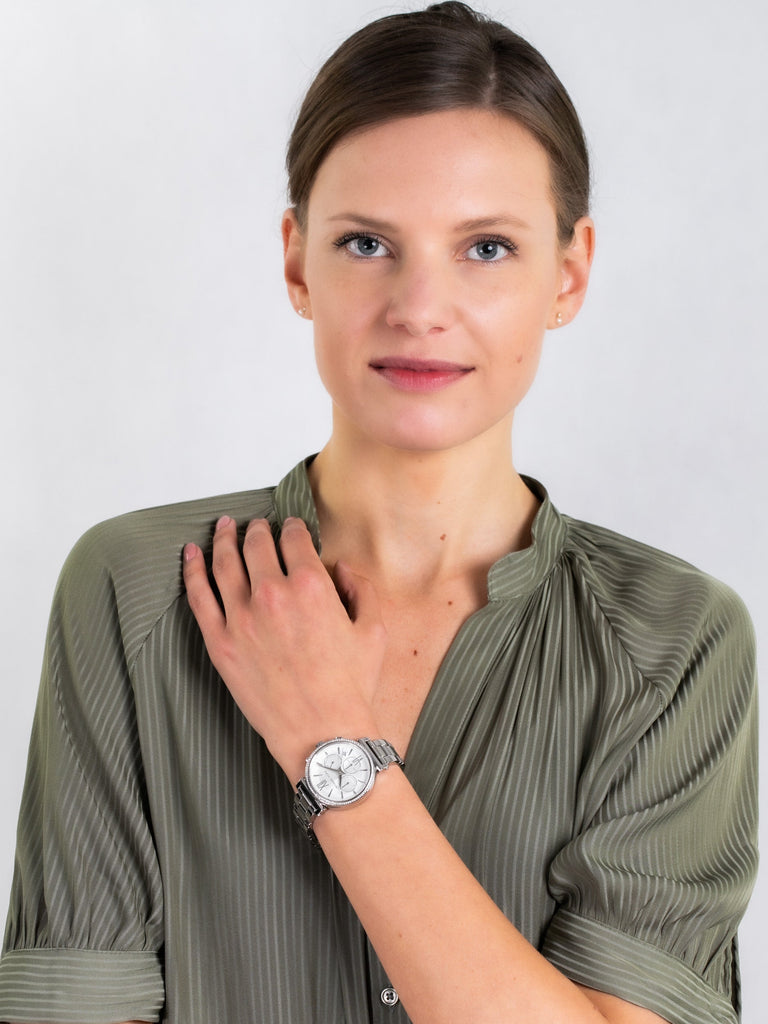 A decidedly sophisticated take on a classic design, the stylish Sofie shines with a stainless-steel rounded case with a glitz top ring, white sunray dial, silver dash markings at all hours except at 6/12 hour, date function and silver three-link bracelet. The reliability and class of Michael Kors makes it a must have for all fashion aficionados.