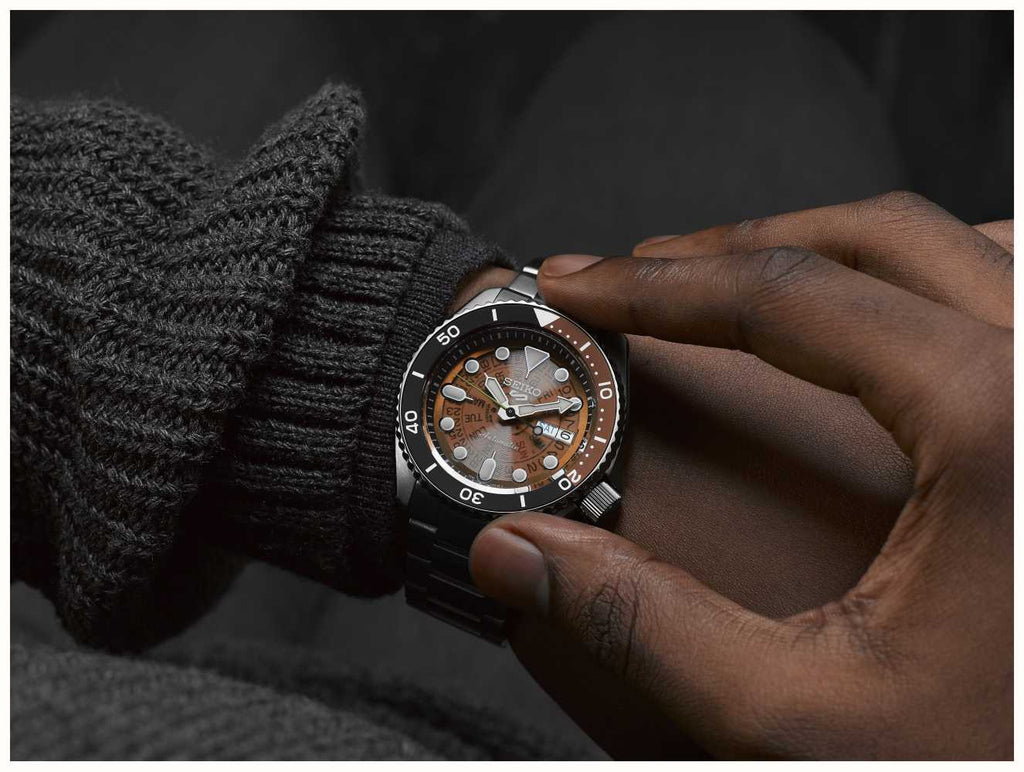 Seiko’s in-house built automatic movement, the 4R36, powers this timepiece. It is a self-wind and manual movement that offers a power reserve of 41 hours. It is water resistant to 100 metres, which means it can be worn when swimming in shallow waters.