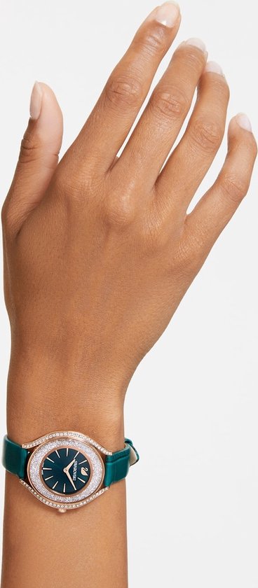 Radiate elegance in this stunning, Swiss Made Crystalline Aura watch. Artfully combining form and function, it features over 1,300 crystals that complement the rose gold-tone finish, and is water-resistant up to 50m. The vibrant green dial is stamped with the Swarovski swan at 12 o'clock and matches the Italian calf-skin leather strap. Fun yet sophisticated, wear it to elevate everyday looks.
