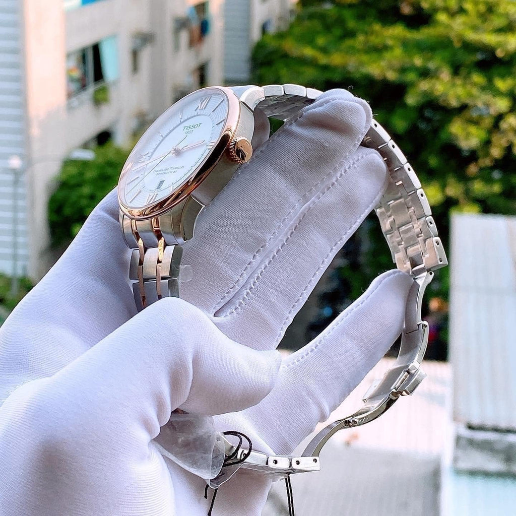 Stainless steel case with a stainless steel bracelet with rose gold PVD links. Fixed rose gold PVD bezel. Silver dial with rose gold-tone alpha-style hands and index hour markers. Roman numerals appear at the 3, 6, 9 and 12 o'clock positions. Minute markers around an inner ring. Dial Type: Analog. Date display above the 6 o'clock position. Powermatic 80.111 automatic movement, containing 23 Jewels, bitting at 28800 vph, and has a power reserve of approximately 80 hours.Scratch resistant sapphire crystal. Transparent case back. Round case shape. Case size: 42 mm. Case thickness: 10.89 mm. Band width: 21 mm. Butterfly clasp. Water resistant at 50 meters / 165 feet. Functions: date, hour, minute, second. Casual watch style. Watch label: Swiss Made. Tissot Chemin des Tourelles Automatic Silver Dial Men's Watch T099.407.22.038.02.