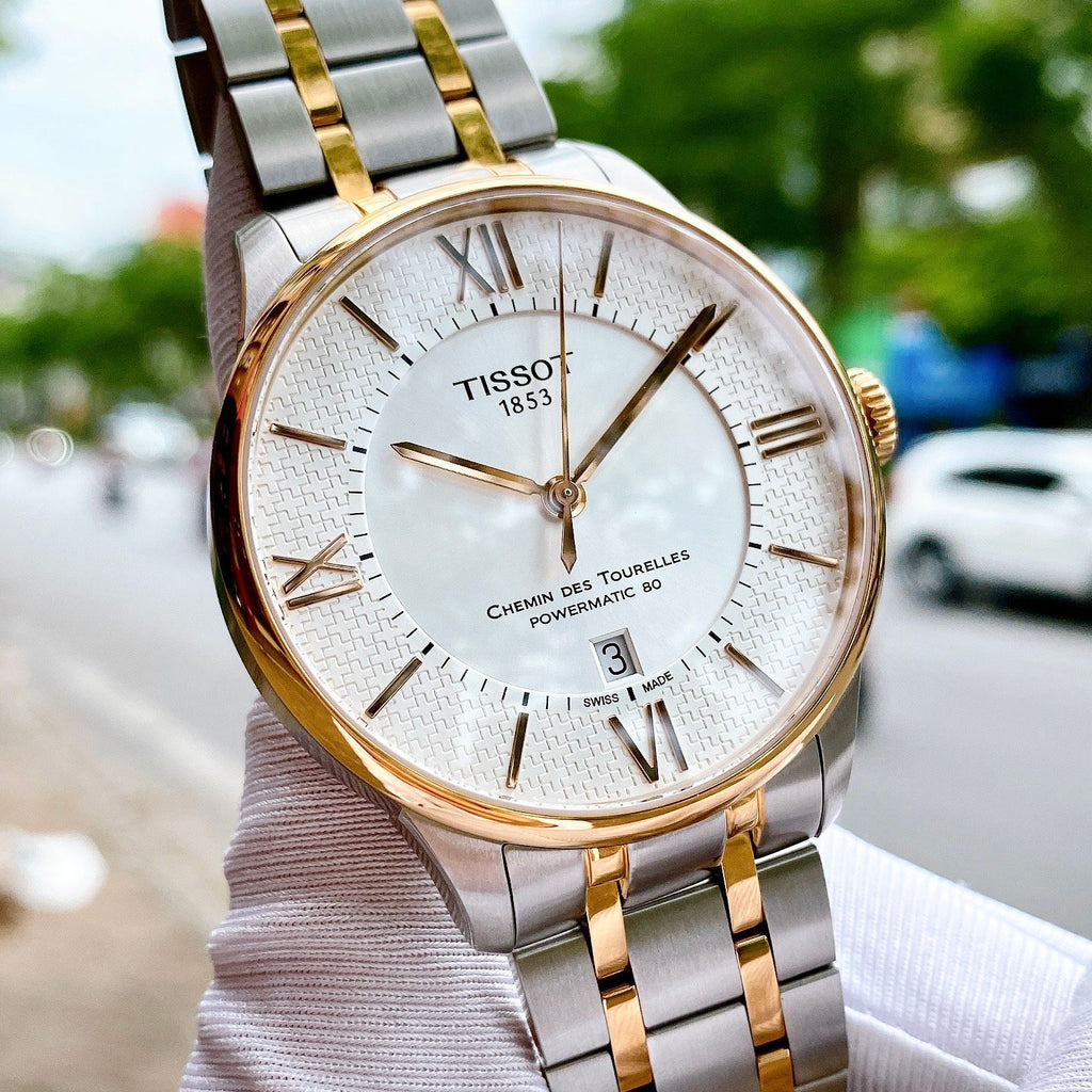 Stainless steel case with a two-tone (silver-tone and rose gold PVD) stainless steel bracelet. Fixed rose gold PVD stainless steel bezel. Silver dial with rose gold-tone alpha-style shape hands and index hour markers. Roman numerals mark the 3, 6, 9 and 12 o'clock positions. Minute markers around an inner ring. Dial Type: Analog. Date display above the 6 o'clock position. Tissot calibre Powermatic 80.111 automatic movement with an 80-hour power reserve. Scratch resistant sapphire crystal. Pull / push crown. Solid case back. Round case shape. Case size: 42 mm. Case thickness: 11.2 mm. Band width: 21 mm. Butterfly clasp. Water resistant at 50 meters / 165 feet. Functions: date, hour, minute, second. Casual watch style. Watch label: Swiss Made. Tissot Chemin des Tourelles Automatic Men's Watch T099.407.22.038.01.