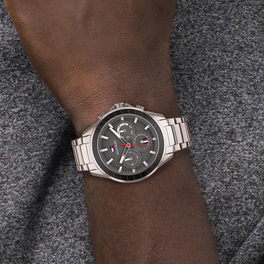 Elevate your style with the Tommy Hilfiger Aiden chronograph watch for men. This sleek watch features a grey dial and silver steel strap, perfect for any occasion. With its precise chronograph movement, you'll always be on time. Add this luxurious timepiece to your collection today!
