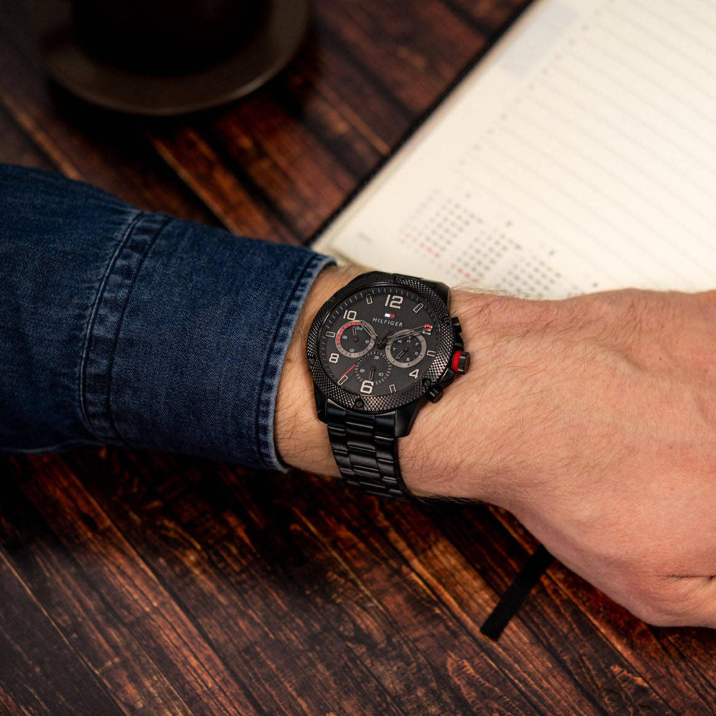 The Tommy Hilfiger Blaze 1792030 watch looks great on a men's watch. It is entirely made of stainless steel , resistant to corrosion. The black case is combined with a wide bracelet with a butterfly clasp . This type of closure is easy and quick to use. This model is equipped with an extensive date display that shows the current day of the month, day of the week and the time in 24-hour format.
