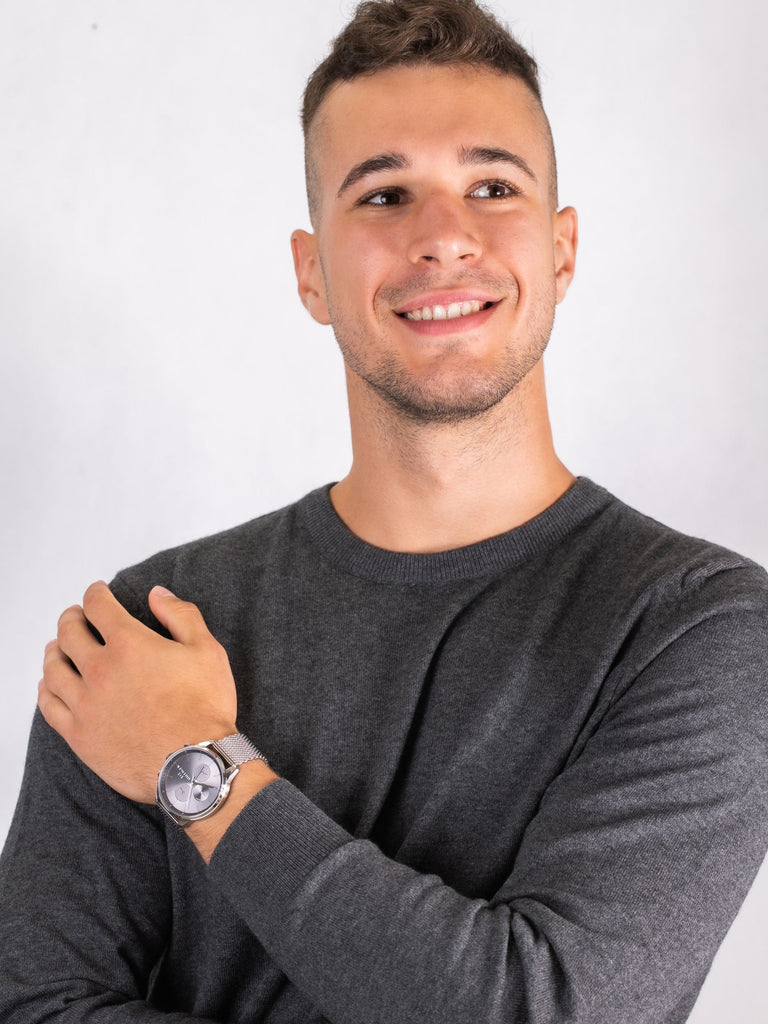 The hardened, mineral glass offers extensive protection against accidental scratches and damage. Underneath, the dial of your new dream watch is grey.