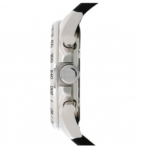Distinctive pole-position style characterizes this men's sport watch. The 46mm solid Stainless Steel case features a crown-protector and bold bezel. The silicone strap give a supercharged spin with racing stripes and a textural checker-board pattern. This new season watch is the racing star of the collection, featuring the iconic red, White and Blue Hilfiger colour palette. Water resistant to 5 ATM /50 meters.