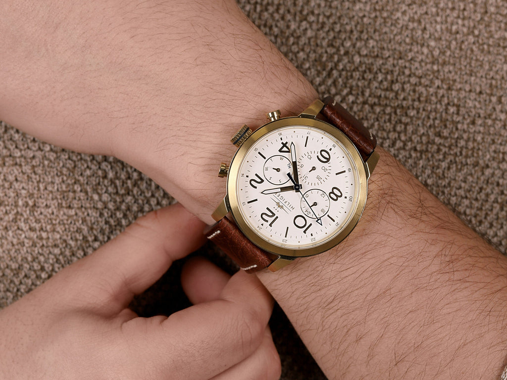 The main dial has a three hand analogue display, with three sub dials (chronographs) showing date, day and 24 hour time.